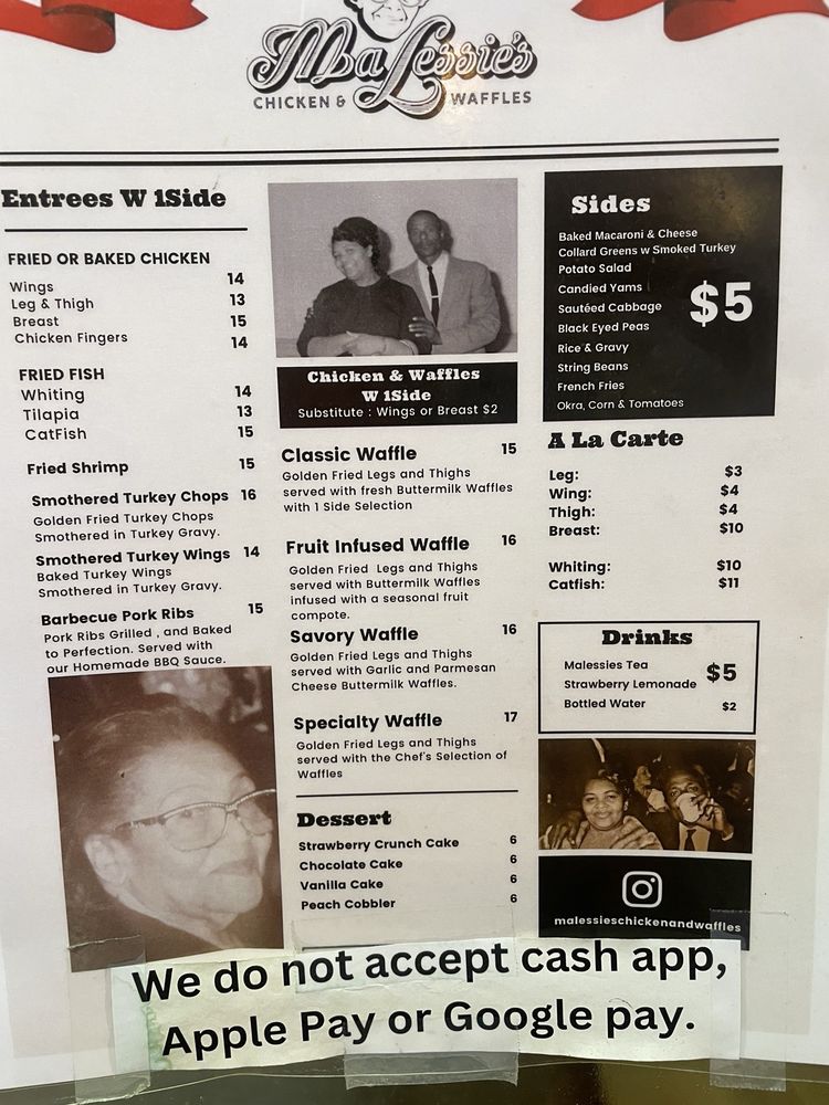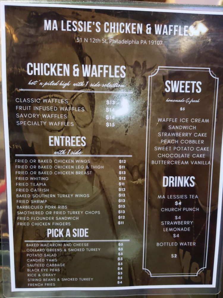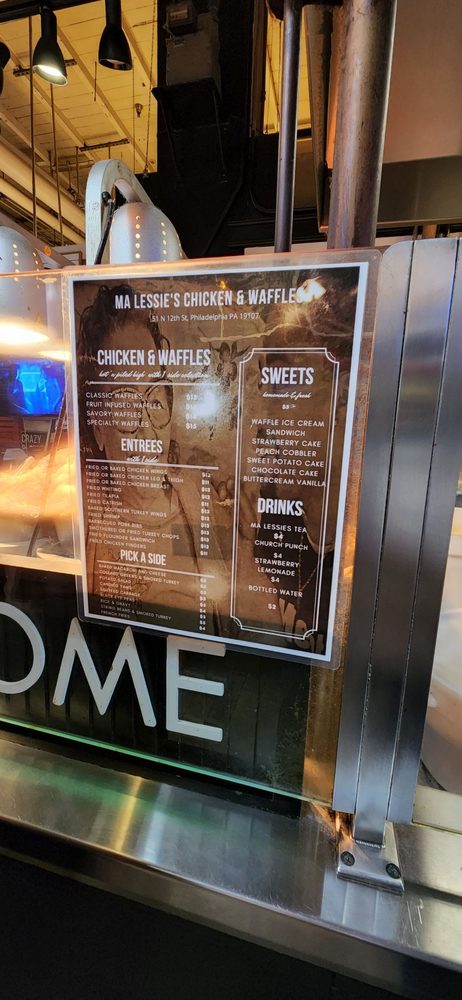 Welcome to Ma Lessie's Chicken & Waffles, where soul food meets Southern charm! Located at 51 N 12th St in Philadelphia's vibrant Reading Terminal, this gem features an enticing menu that truly delights the senses. The star is undoubtedly the crispy fried chicken, available as wings, breasts, and thighs, all expertly seasoned to perfection. Don't miss the fried seafood selections, including whiting, tilapia, and succulent catfish.